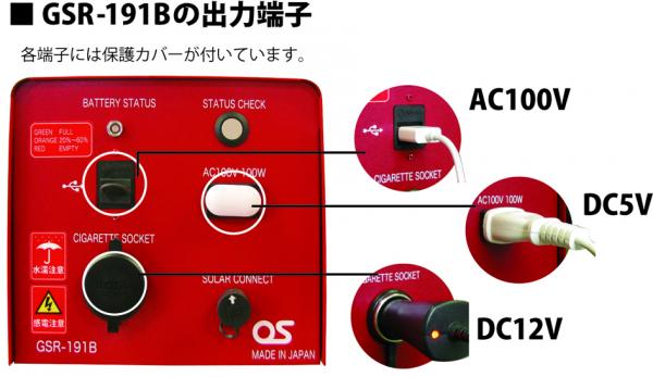 GSR-191BはAC100Vの出力コンセントを持ち、インバーターなどの変換器なしで直接本体より電力供給が可能です。またDC12Vシガーソケット出力端子、DC5V USB出力端子も備え、使用可能な電気製品が飛躍的に拡大しました。オーエスではこのAC100Vモデルを通信用の二次電源として開発しました。排気ガスの出ないクリーンエネルギーの太陽光発電は、ビル内の防災センター、ビル管理室への常備備品としてお勧めいたします。