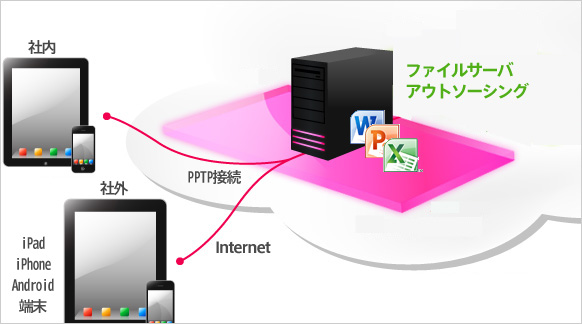 ファイルサーバ アウトソーシングへの通信接続はPPTPプロトコルを介して実現します。オフィス文書を始め、PDF/テキストファイルなどを閲覧(編集)することができます。