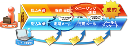 営業担当者は、任意の条件で対象顧客を抽出した配信リストと対象顧客にマッチした内容のお知らせメールやフォローメール、メールマガジンを指定の日時にセットするだけで、配信は“バーチャル営業マン”が代行します。これにより、営業担当者が各顧客にOne to Oneで送っているようなメールを、タイムリーかつ顧客ニーズに沿った内容でもれなく配信することができるので、コールドリードを効率的にホットリードへと育成していくことができます。