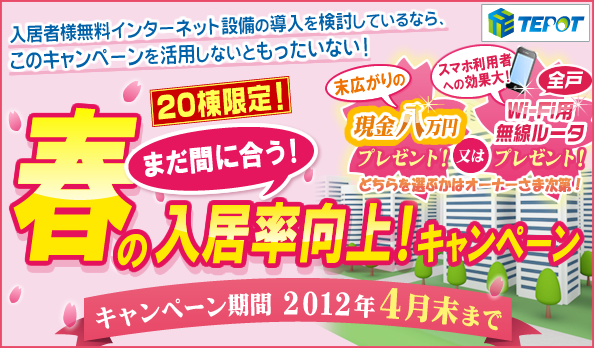 期間限定キャンペーンとして、4月末までに、入居者無料インターネット設備「TEPOT(テポット)」