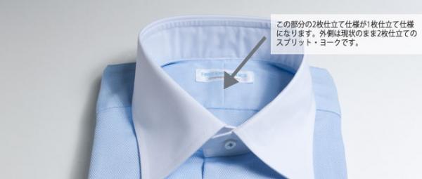 オーダーシャツのファースト・エクスペリエンス(運営:株式会社グローバルグロー・イマジン)では、T/C素材のスプリットヨークに関して、内側(FIRST EXPERIENCEネーム柄)を現在のスプリット・ヨーク(2枚仕立て)から一枚仕立てへと変更したします。外側(背中側の着用した時に見える側)は、従来どおりのスプリット・ヨークとなります。