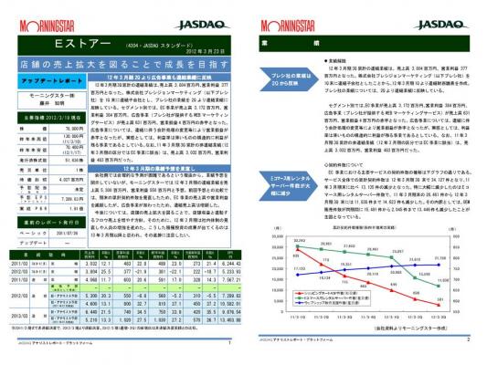12年3月期3Q累計の連結業績は,売上高 3,804百万円,営業利益 377百万円となった。株式会社プレシジョンマーケティング(以下プレシ社)を1Q末に連結子会社とし,プレシ社の業績を2Qより連結業績に反映している。セグメント別では,EC事業が売上高 3,172百万円,営業利益 384百万円,広告事業(プレシ社が提供するWEBマーケティングサービス)が売上高631百万円,営業損益4百万円の赤字となった。広告事業については,連結に伴う会計処理の変更等により営業損益が赤字となったが・・・