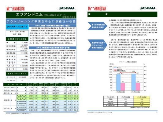 12年3月期第3四半期累計の連結業績は,売上高が27億8,400万円(前年同期比2.2%増),営業利益が2億6,400万円(同8.6%増)と,増収・増益となった。売上高については,記帳代行会員数の増加を背景に主力事業のアウトソーシング事業で増加したほか,エフアンドエムクラブ事業でも増収。一方・・・