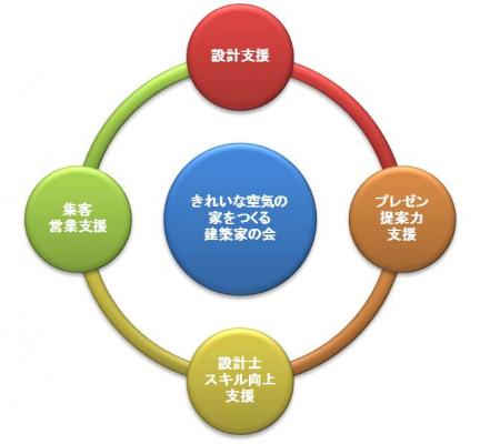 この設計提案力向上において具体的な支援体制を構築するため、設計思想が合致し、自然素材を活かした住まいづくりに精通した建築家とのマッチングを企画、「NPO家づくりの会」代表理事の(有)U設計室代表落合雄二氏、赤沼修設計事務所主宰赤沼修氏、北風舎主宰吉原健一氏の3名に協力いただき、「きれいな空気の家研究会設計支援チーム」を立ち上げることとなりました。モデルハウス開発企画・設計の支援とともに、プラン・デザイン提案力支援としての基本設計支援システムを用意。また、設計担当者スキル向上のため、4月より設計講座を開講。1年間で各テーマに基づいた指導を行います。なお、現在千葉の会員工務店さんにてチーム代表である落合雄二先生企画のモデルハウスが8月にオープン予定です。本企画は、研究会会員企業を中心に設計支援メニューが積極的に採用され、設計(提案)力を高めていただくための取り組みとなります。