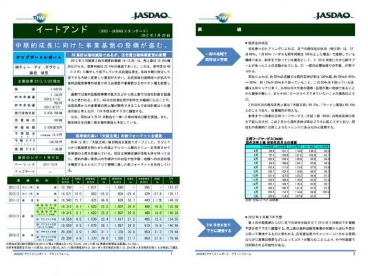 2012年3月期第3四半期累計業績(4-12月)は,売上高は10.0%増収ながらも,営業利益は25.0%の減益であった。これは,前年度は4Q(1-3月)に集中して投下していた広告宣伝費を,各四半期に按分して投下する方針に変更した要因が大きい。出店地域の遠隔地への拡大や食料品販売事業の成長に伴う出張費や倉庫費などのコスト増も影響した。通期では・・・