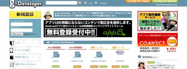 g-Developerは、スマートフォンアプリの開発者を支援する登録無料のサイトとして、2011年1月下旬より運営されており、現在は法人・個人の登録を合計して260社の