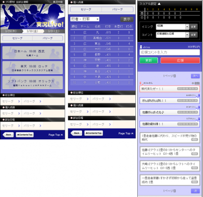 「実況Live!」では、実況サービス以外に、選手成績・チーム成績などもリアルタイムに表示されます。