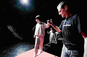水曜日にサンズ・マカオ・シアターにて開催された綱渡りワークショップで、生徒のバランス練習を注意深く見るスカイウォーカー、ジェイド・キンダーマーティン氏。キンダーマーティン氏と妻カリン・モフリー氏は4月11日のサンズ・コタイ・セントラル開業での綱渡りに先駆けLar de S. Jose Ka-Ho寄宿制学校の生徒にむけてワークショップを行った。
