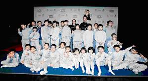 スカイウォーカー兼、プロのスタントウーマンのカリン・モフリー氏とLar de S. Jose Ka-Ho学校の生徒。彼女と夫、ジェイド・キンダーマーティン氏が4月11日のサンズ・コタイ・セントラル開業での綱渡りに先駆け、水曜日、サンズ・マカオ・シアターにて綱渡りワークショップを開催した。