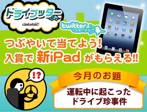 ・ 抽選対象者:お題「ドライブ中に起こった珍事件」を、キャンペーンサイトのツイッターフォームからつぶやいていただき、その上で応募フォームからご応募いただいた方
