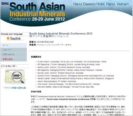昨年の「Vietnamese Industrial Minerals Conference(ベトナム工業鉱物会議)」の成功を受け、本年も2012年6月28、29日、ハノイにて、「South Asian Industrial Minerals Conference」を開催いたしますことをここにお知らせいたします。