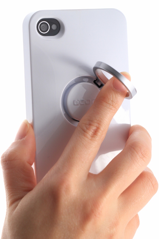 ・ iPhoneを手に持って操作するときに、起こしたリングに指を通しておくと安定します。
