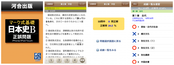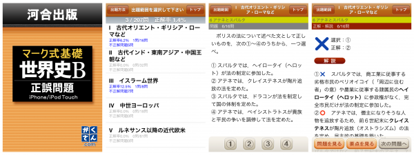 学習専門図書サイバーモール「学参ドットコム」などを運営する株式会社ブックモールジャパン(本社:埼玉県戸田市、代表取締役社長:山田俊明)は、iPhone 向け学習アプリケーションの新作として、株式会社河合出版の協力のもと、高校生向け学習参考書「マーク式基礎問題集」シリーズより『河合出版マーク式基礎世界史B[正誤問題]』『河合出版マーク式基礎日本史B[正誤問題]』を開発し、4月11日より App Store での発売を開始しました。