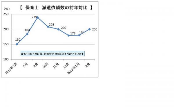 ニッソーネットでは、これまで「現場ですぐ使える遊び」のセミナーを不定期に実施しておりました。近年、参加者から開催頻度や内容を充実させてほしいとの要望が高まり、また、保育士派遣依頼数も増加傾向にあるため(右グラフ参照)、今後は介護だけでなく、保育士向けの教育・研修メニューを追加し充実していきたいと考えました。
