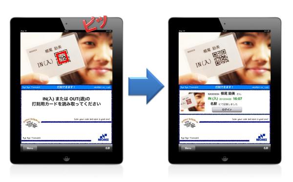 iPadにQRコードのプリントされたカードを読み取らせる打刻操作は、とても簡単で快適です。
