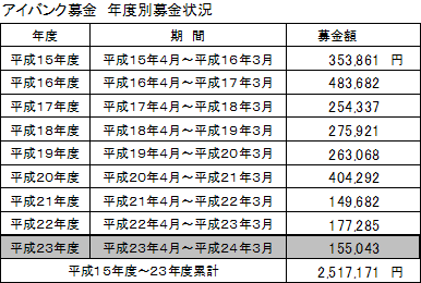 今回は平成23年4月から平成24年3月の間に集めた155,043円を寄付した。