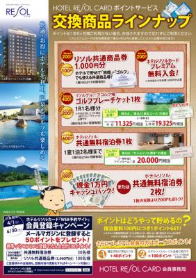 ■交換商品(4):「ホテルリソル」共通無料宿泊券1枚(1室1泊2名様まで/発行日より6カ月間有効)=プレミアム会員600ポイントで交換可能。