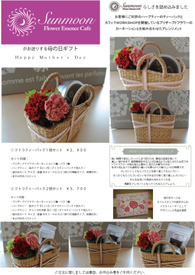 有限会社AYUSBAY(アユスベイ)(本社:東京都武蔵野市 代表取締役:高島なゆみ)が運営する、ハーブティーをメインとした飲み物とともに、フラワーエッセンス・アロマオイルを一緒に楽しむことができるという、今までにないスタイルが話題となっているカフェ、Sunmoon Flower Essence Cafeでは、母の日ギフトのお申し込みの受付をスタートさせた。