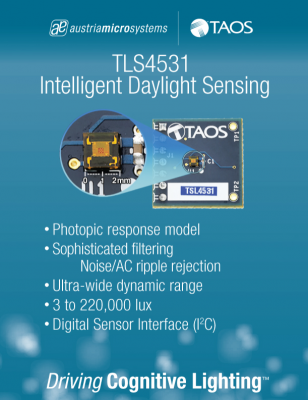 TSL4531照度センサICは現在、量産出荷中です。このデバイスに関するさらに詳しい情報はこちらをご覧ください。www.austriamicrosystems.comおよびwww.taosinc.com.