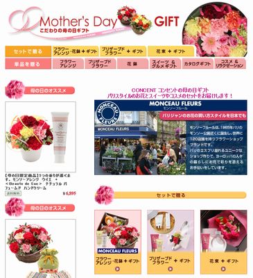 コンセント株式会社(以下コンセント、所在地:東京都港区 代表取締役:小松 廣之)は、コンセントが運営するインターネットのギフトショップ「CONCENT」で、パリのフラワーブランド「MONCEAU FLEURS(モンソーフルール)」のフラワーアレンジとスイーツやコスメのセットを中心に取り揃えた「母の日特集」を開始しました。