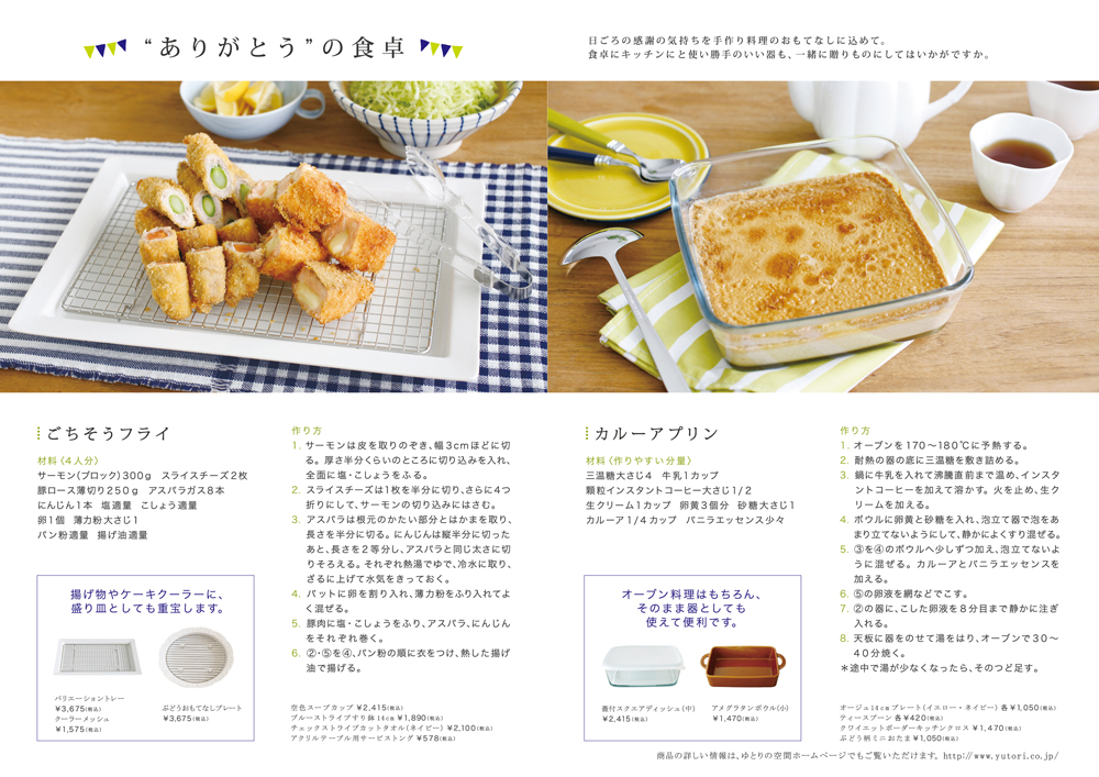 母の日に、日頃の感謝の気持ちを込めて贈る手作り料理におすすめのレシピ「ごちそうフライ」「カルーアプリン」を掲載したミニブックを、全国の「ゆとりの空間」「share with Kurihara harumi」(ショップ併設店舗のみ)で配布します。