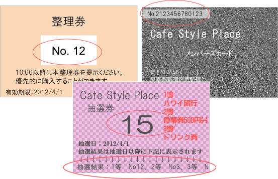 フリカの画像中にシリアルナンバーを表示することができますので、抽選券として活用することが可能です。