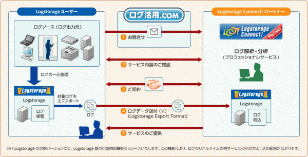「Logstorage Connect!」は、国内シェア54%を誇るデファクトスタンダードの統合ログ管理システム「Logstorage」 と、ログ分析・活用のプロフェッショナル企業のサービスとをつなぐ枠組みで、これにより「Logstorage」で管理されているログを、様々なサービス上で利用することが可能になります。