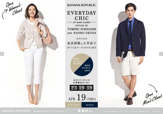 スタイリスト祐真朋樹氏と大草直子氏がバナナ・リパブリックでつくる30日分のスタイルを、メンズ・ウィメンズそれぞれ毎日1体ずつ、キャンペーンサイトにて紹介していくもので、ウィークデイからウィークエンドまで、様々なシーンを想定したスタイルが毎日更新されるので、30日間通して楽しむことができます。