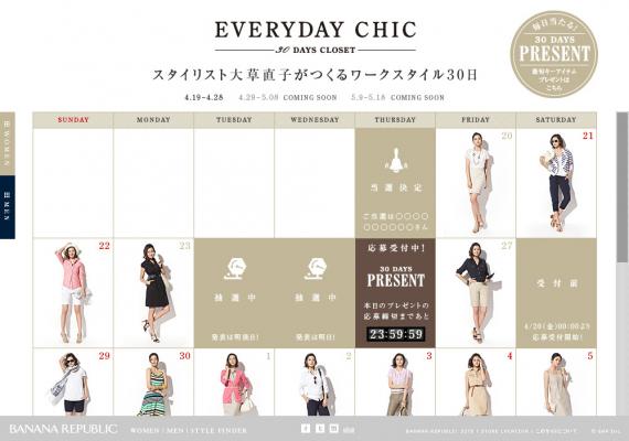 同時にキャンペーンサイトでは、当日アップされるスタイルの核となる、スタイリスト一押しのバナナ・リパブリックの最旬アイテムが、30日間毎日当たるプレゼントキャンペーンを実施します。このプレゼントキャンペーンは、TwitterまたはFacebookへログインし、ニックネームをご登録するだけで、どなたでもご応募することが可能です。詳細は下記ご確認