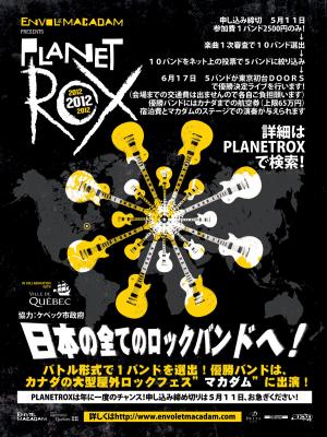 PLANETROXは、ケベック政府と協力して行うEnvol et Macadamの最初のプロジェクトです。世界規模で行われるこのイベントの使命は、各国から参加している将来有望なバンドを発掘し、毎年9月に行われるEnvol et Macadamフェスティバルで演奏させることです。PLANETROX開催初年度の今年は、カナダのほかにアメリカ、フランス、ベルギー、イギリス、ドイツ、ノルウェイ、アイルランド、イタリア、スペイン、日本、中国、マレーシア、インドネシア、そして韓国が参加します。