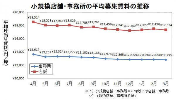 また、小規模店舗の平均募集賃料も、前月まで2ヶ月連続で上昇しましたが、3月は-0.8%の下落となりました。
