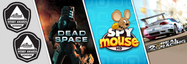 タブレットおよびその他全デバイス版のゲームカテゴリーでノミネートされている『Real Racing 2』は、定評ある開発スタジオ『Firemint Studio』による驚きの美麗グラフィックスがプレイヤーを魅了してやまない、アドレナリン全開で王座を争うレーシングアクションゲームです。そしてEA Mobileからは、『SPY mouse』と『Dead SpaceTM』も最終選考タイトルとして受賞候補に残っています。