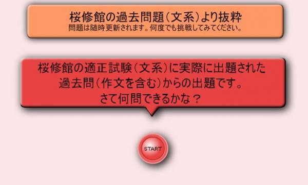 人気の都立桜修館中等教育学校の7年分の適性試験過去問の文系問題をクイズ形式にしたゲームです。これは中学受験専門プロ個別指導塾ノアの飯塚塾長、作文担当の本田講師、国語担当の小野寺講師が研究開発しました。問題は随時更新されます。また何度でも挑戦できますので、遊び感覚で桜修館の過去問を勉強できます。