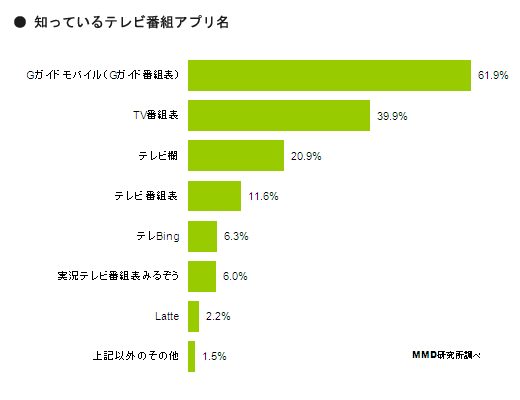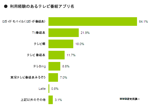 また、テレビ番組アプリ利用経験者を対象に、利用しているあるいは利用していたテレビ番組アプリについて調査したところ、認知度調査と同様に「Gガイドモバイル」と回答したユーザーが64.1%と圧倒的に多く、次いで「TV番組表」と回答したユーザーが21.9%、「テレビ欄」と回答したユーザーが18.0%という結果となった。