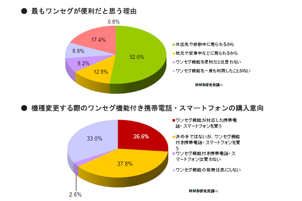 次に、現在使用している携帯電話・スマートフォンを機種変更する際に、ワンセグ機能付きの携帯電話・スマートフォンの購入意向について調査したところ、「ワンセグ機能が対応した携帯電話・スマートフォンを買う」と回答したユーザーが26.6%、「決め手ではないが、ワンセグ機能付き携帯電話・スマートフォンを買う」と回答したユーザーが37.8%と、合わせて64.4%のユーザーがワンセグ付の携帯電話・スマートフォンを購入すると回答していることがわかった。