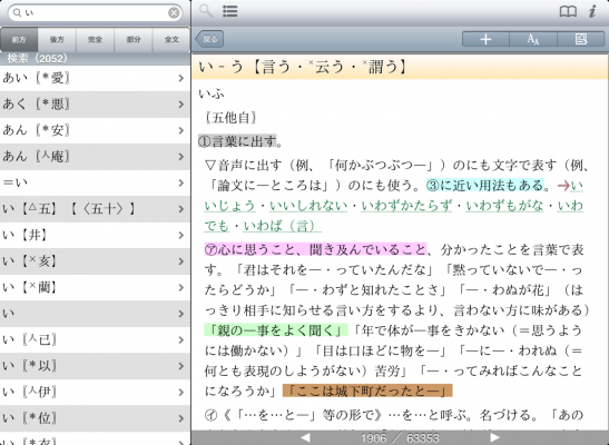 LogoVista電子辞典で培った検索方法を継承。前方一致/後方一致/完全一致/部分一致/全文検索といった豊富な検索オプションを利用できます。また文字を入力すると候補見出し語が表示され、うろ覚えでも検索できるインクリメンタルサーチや、検索結果に表示された本文中の用語をなぞることでそのまま連続辞書引きも可能。思考を妨げることなく次々と検索できるのが特長です。マルチタッチによる拡大やセンサーによる画面の回転にも対応しています。