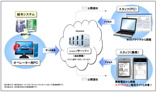 市販給与計算ソフトで作成された給与明細書を電子化して、従業員のパソコン・携帯電話・スマートフォンから専用ウェブサイトを通じて閲覧可能とするサービスです。