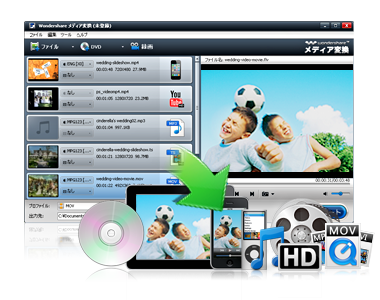 Wondershare『メディア変換』(Win版)は、あらゆるメディアファイル(動画・音楽・DVD)変換に対応可能で、まさに強力な変換ソフトウェアです。様々なビデオ形式に対応しており、特にiPhone 4S、iPhone 4 HD、iPhone・iPod・iPad用の動画が楽々変換できます。動画・音楽・DVD、あらゆるプレーヤーで楽しめます!