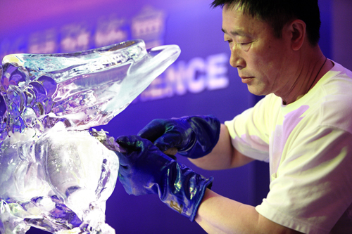 氷像彫刻家 Yu Zhengqiang氏による実演彫刻。アイスワールド2012開催を告知したベネチアンマカオ、プレス会見にて