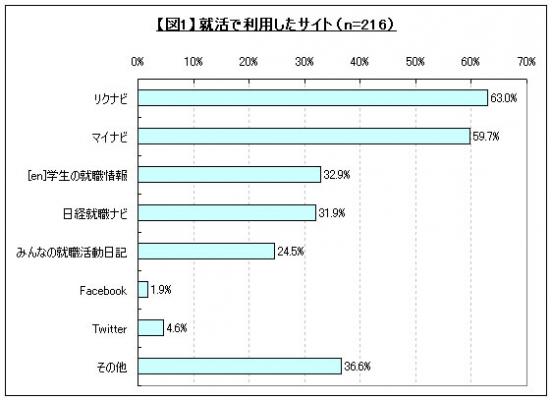 今年の新社会人の男女に対して「就職活動で利用したサイト」についてモバイルリサーチで聞いたところ、1位「リクナビ」(63.0%)、2位「マイナビ」(59.7%)と大手の就職情報サイトが上位を占める結果となった(図1参照)。最近では企業側がFacebookやTwitterを利用して採用に関する情報を提供するような流れも出てきているが、学生側で実際にSNSを利用していた人の割合は「Facebook」で1.9%、「Twitter」で4.6%とまだごくわずかであることがわかった。今後、企業側がSNSを利用した採用活動にどれだけ力を入れていくのかによって、学生の就職活動方法も変わっていきそうだ。
