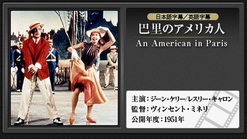 1951年度のアカデミー作品賞をはじめ、8つの部門に受賞したテクニカラーのダンス・ミュージカル映画で、ジョージ・ガーシュウィン作曲の「巴里のアメリカ人」を主題とした作品。