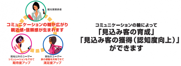 観光業界関係者とユーザー、ユーザー同士のコミュニケーションができることでユーザーからも情報が発信(クチコミ)され、地域独自の魅力をリアリティーのある信頼できる情報(クチコミ)として、多くの方に知っていただくことが出来るようになります。