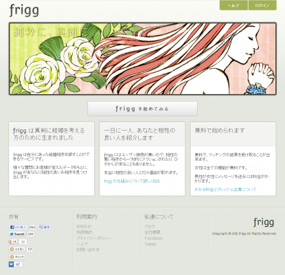 「frigg」(http://frigg.lv/)とは、「無防備に大多数の人に公開されてしまう」、「テンプレートメールが大量に送られてくる」、「代わり映えのない検索結果に飽きてしまう」といった、既存の婚活サービスが抱える課題を解決した、新しいソーシャル婚活サービスです。
