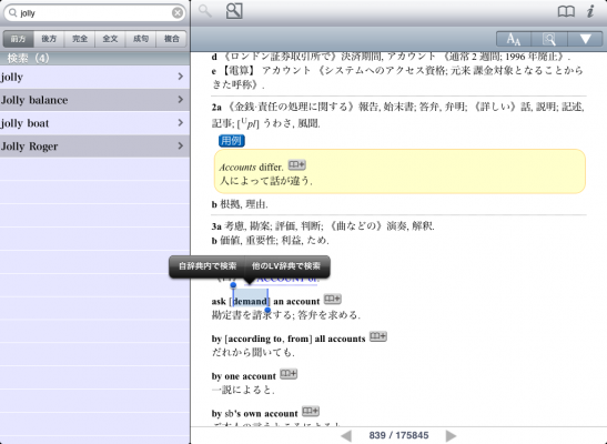 ● 本文中の用語をなぞることで次々に辞書引きができる検索ジャンプ機能。(*要iOS3.2以降)