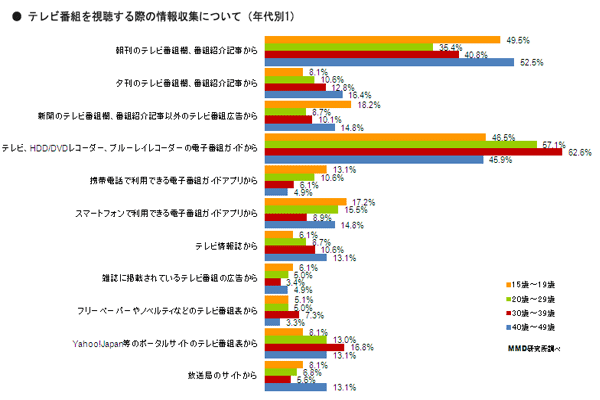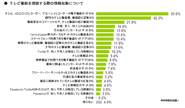 テレビ番組を視聴する際、どこから情報収集を行うかについて調査したところ、「テレビ、HDD/DVDレコーダー、ブルーレイレコーダーの電子番組ガイドから」と回答したユーザーが55.6%と最も多く、次いで「朝刊のテレビ番組欄、番組紹介記事から」42.2%という結果となった。