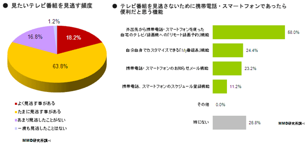 見たいテレビ番組を見逃さないために、携帯電話・スマートフォンで、あったら便利(使う)と思う機能について調査したところ、「外出先から携帯電話・スマートフォンを使った自宅のテレビ/録画機へのリモート録画予約機能」と回答したユーザーが58.0%と最も多く、次いで「自分自身でカスタマイズできるMy番組表」と回答したユーザーが24.4%、と、外で使える録画機能についてのニーズの高さが目立った。