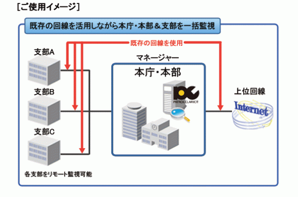 パトロールクラリスは、監視対象の機器毎にエージェント(監視プログラム)を設置しないエージェントレス方式を採用した監視ソフトウェアで、本製品を導入した1台の監視サーバーから、組織全体のシステムを構成する機器(サーバー・ネットワーク)、アプリケーション層を一元的に監視することが可能で す。そのため、監視製品の導入・運用に関わる人的な労務負担、監視対象への負荷、製品自体のコストを大幅に削減することができ、さらに、ユーザビリティに優れた使いやすい直感的なインターフェースを持っている純国産の完全日本語対応の監視製品であることから、官庁・自治体・学校・大手企業をはじめとする国内600以上の法人様にご導入いただいております。