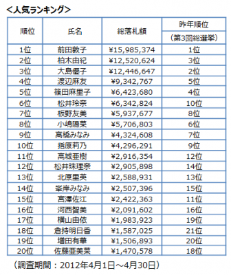 総選挙前(2012年4月1日~4月30日)のネットオークション市場において、過去に実施された第3回AKB総選挙21位以内に選抜されたメンバーを分析しました。そして、「総落札額」のデータを利用し、メンバーの関連商品の総落札額ランキングを発表いたしました。