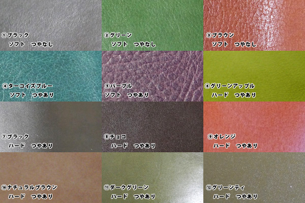 栃木レザー等高品質なレザーのみ厳選し、カラフルな12色(2012年5月現在)から2色をお好みで組み合わせて