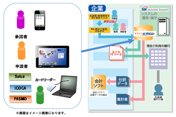 「スマート経費精算」は、経理業務の一層の標準化と効率化(仕訳データ作成・FBデータ作成など)を目指し、申請・承認者の利便性を追求したタブレットからの申請、およびスマートフォン(注1)での承認を可能にしました。またICカードオプション(注2)をご利用いただくことで申請者の入力工数を大幅に軽減できます。